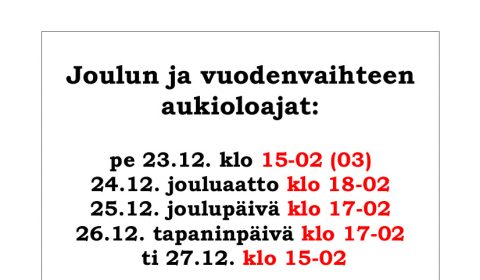 Joulun ja vuodenvaihteen aukioloajat 2022